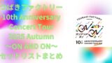 2025年4月30日、日本武道館にて、「つばきファクトリー 10th Anniversary Concert at BUDOKAN ~OUR DAYS~」が開催されました。つばきファクトリー結成10周年を祝う公演であり、メンバーの八木栞が卒業する、つばきファクトリーとしては節目となるコンサートになりました。この記事では、セットリストをまとめています。