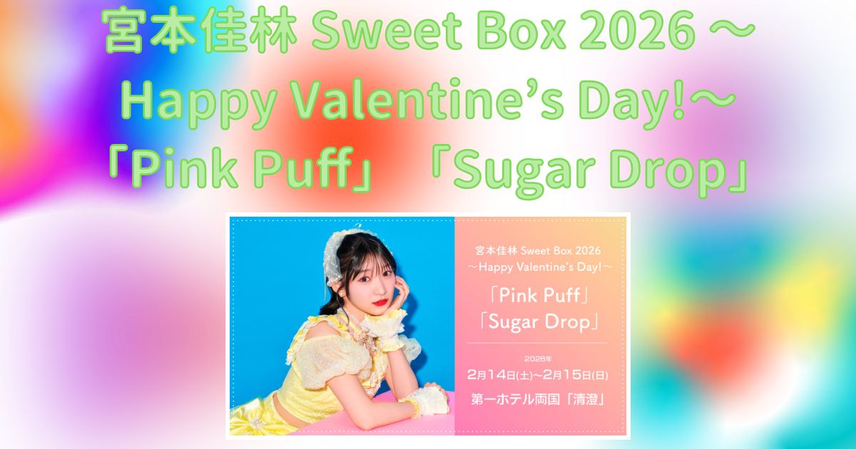 2026年2月14日、15日の2日間、第一ホテル両国「清澄」にて、「宮本佳林 Sweet Box 2026 ~Happy Valentine’s Day!~」が開催されました。この公演は、「Pink Puff」と「Sugar Drop」の2パターンで構成されていました。この記事では、開催日程とセットリストをまとめています。